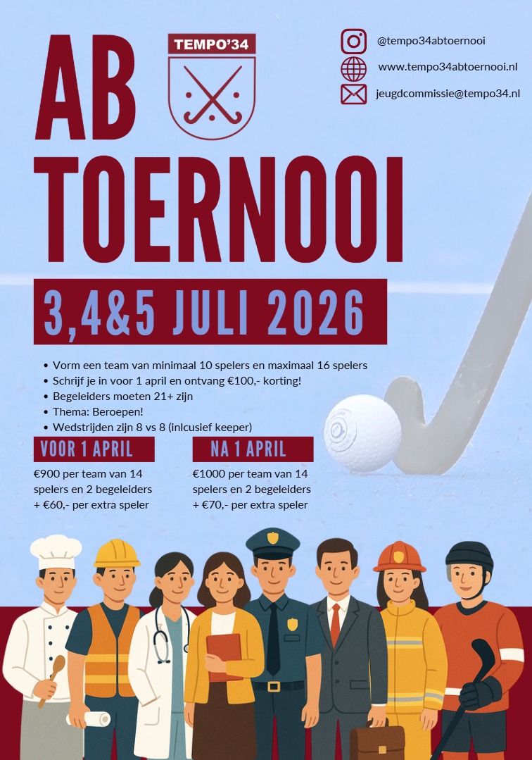 In juli is het weer zover: drie dagen hockey, feest en gezelligheid tijdens het jaarlijkse AB-toernooi bij Tempo ’34. Het terrein staat dit jaar volledig in het teken van het thema “Beroepen”, dus haal je creatiefste outfit uit de kast en maak er samen met honderden leeftijdsgenoten een topweekend van.